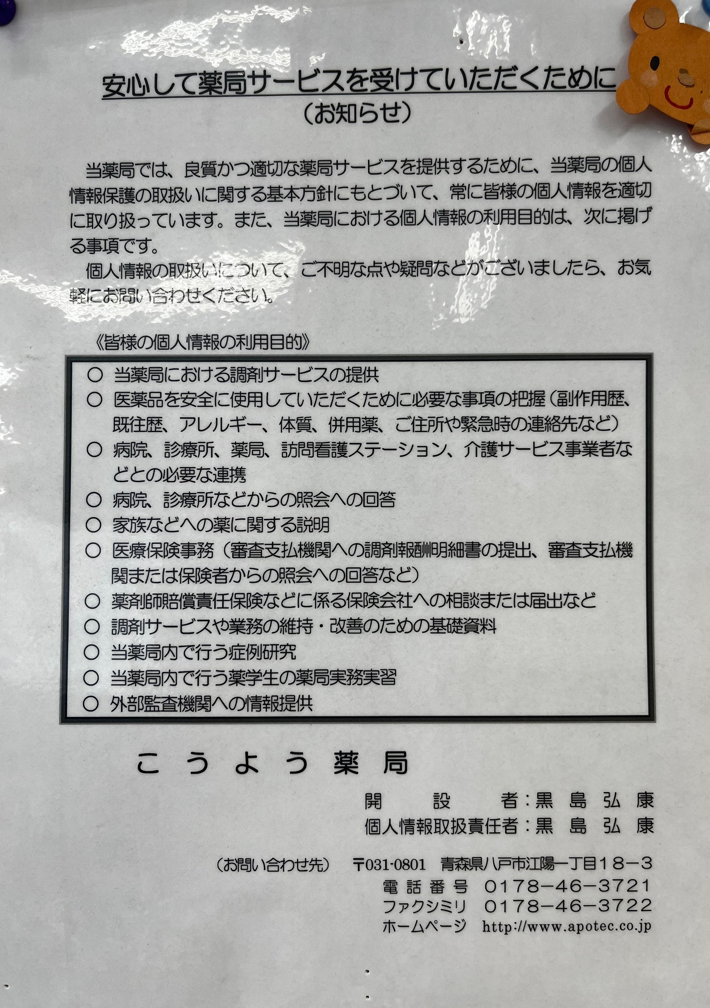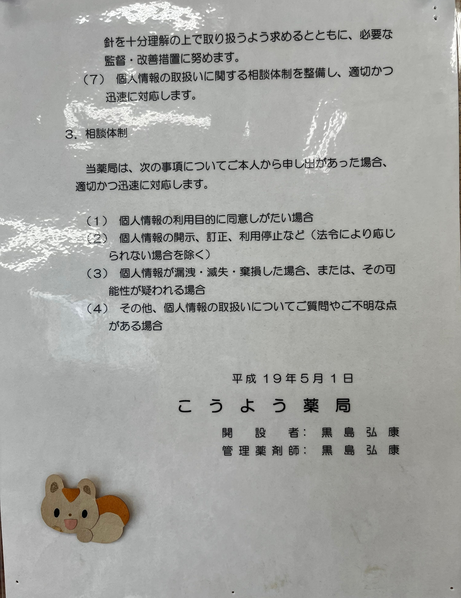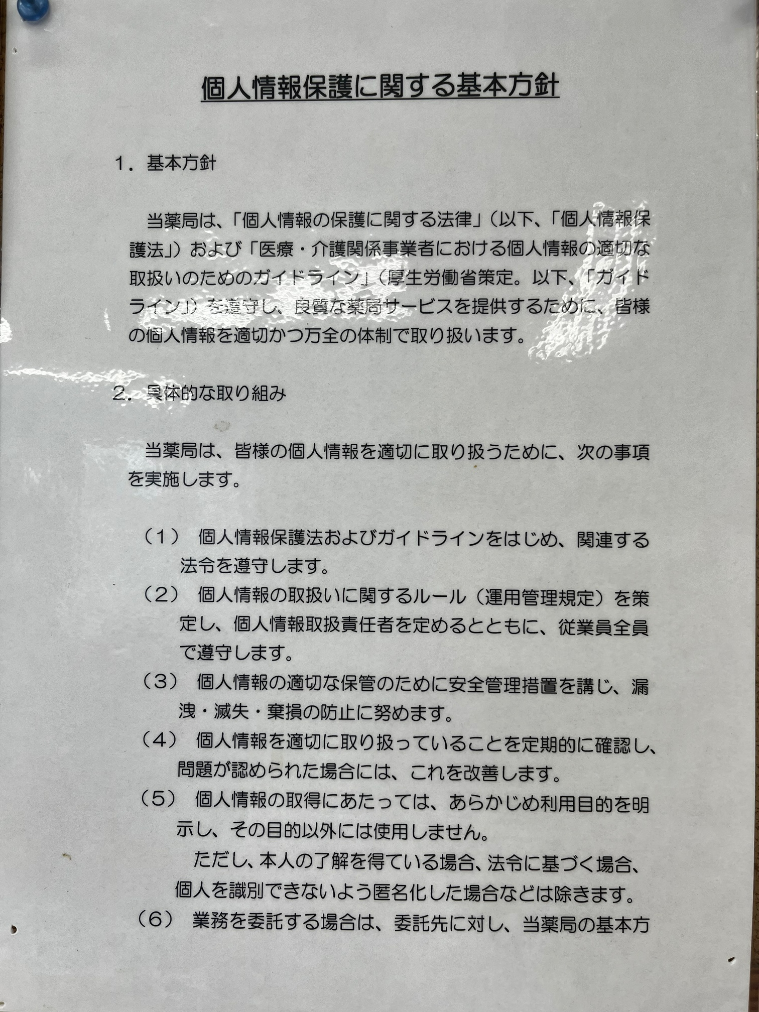 良質かつ適切な薬局サービス提供のため、個人情報保護の取り扱いに関する基本方針に基づいて常に患者様の個人情報を適切に取り扱っています。